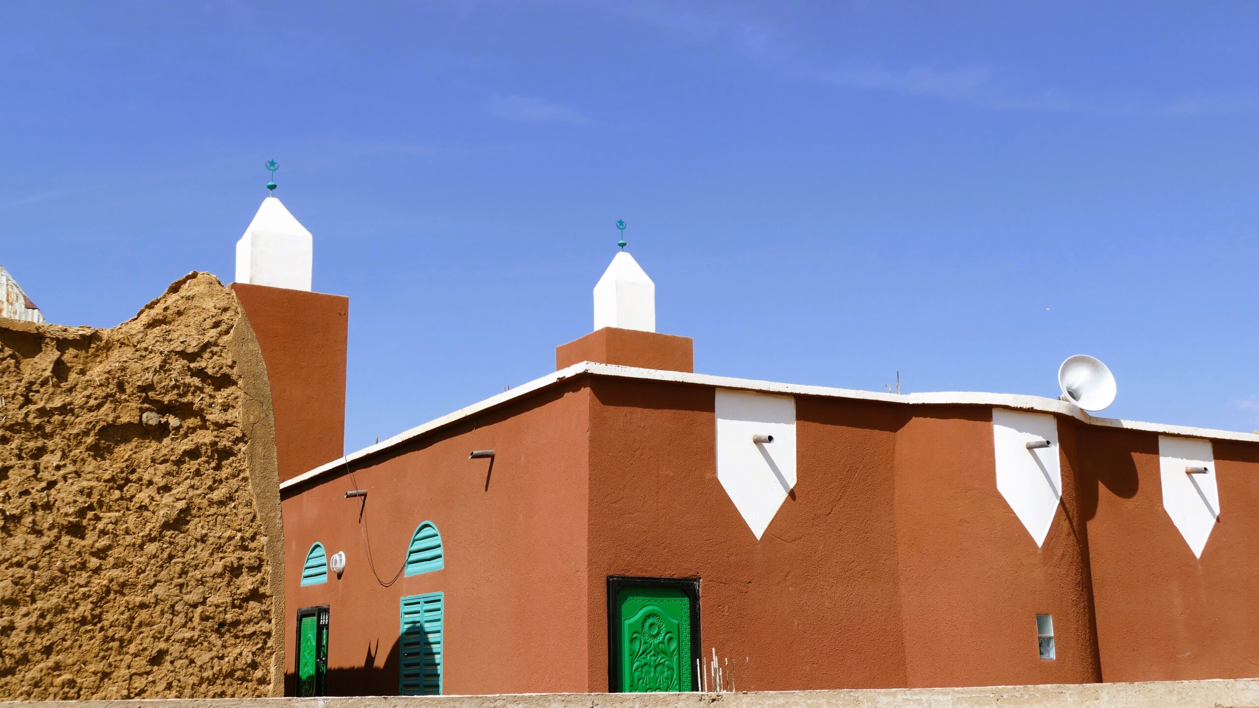 - La mosquée de Guédé, plus rafinée, présente des tourelles d’angle au sommet conique et des linteaux de porte décorés de dessins géométriques.